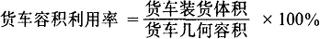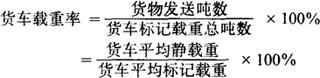 以相对数字反映货车装货能力利用程度的指标。 可分为货车载重力利用率和货车容积利用率两种。 1.货车载重力利用率,简称载重率,是指车站、分局、铁路局或全路在一定时期内所装全部货车的载重能力被利用的百分数。 其计算公式如下:  从上式中可看出,货车载重率的大小同货车静载重成正比,而同货车平均标记载重成反比。当货车静载重愈高时,货车载重率就愈大。因此,一切提高货车静载重的措施,也是提高货车载重率的措施。 2.货车容积利用率,是指货物装入货车,对货车几何容积利用的百分数,其计算公式如下:  货车容积利用率指标一般情况下不用。 |