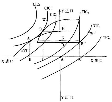一种研究国际贸易的几何分析工具。 由英国经济学家米德(J.E.Meade)在其1952年的《国际贸易几何学》一书中提出。 在图中,PPF为国家Ⅰ的生产可能性边界。A点为自给自足均衡点,在A点与PPF相切的社会无差异曲线为CIC1,此时相对应的PPF的原点为A*。现在在第二象限中我们把整个生产可能性边界向上滑动,使它始终与CIC1相切,图中画出了当PPF整体上滑与CIC1再次相切于B点的情况,此时相对应的PPF的原点为B*点。如此下去,我们把与A、B、W等切点相对应的A*、B*、W*诸点连成轨迹,就构成了对应于CIC1的第一象限内的贸易无差异曲线TIC1。它表明了为保持和CIC1相同的福利水平该国应进行怎样的贸易交换。  在贸易无差异曲线的推导中之所以要移动整个PPF是想表现出贸易后生产与消费的分离。如图中所示,在A点的自给自足均衡时生产和消费都是EA*单位的X产品和GA*单位的Y产品。 而当PPF上滑到与B点相切后,消费仍以原点A*观之,为FA*单位的X和BF=HA*单位的Y,但生产却要从新的PPF上看,即以B*为原点观之,为FK单位的X和HD单位的Y。 因此为保持其消费福利水平CIC1不变,该国需出口FK-FA*=A*K单位的X和进口AH*-HD=DA*单位的Y,这正是TIC1上B点的坐标。 对应于每一条CIC都会有一条TIC。CIC越高,TIC也越高,如图中TIC2对应于CIC2,TIC3对应于CIC3,这样构成一组贸易无差异曲线族。 每一条贸易条件(TOT)线都会与这一组无差异曲线族中的一条TIC相切,把这些切点连成轨迹即得到国家Ⅰ在各种不同贸易条件下的提供曲线。 |