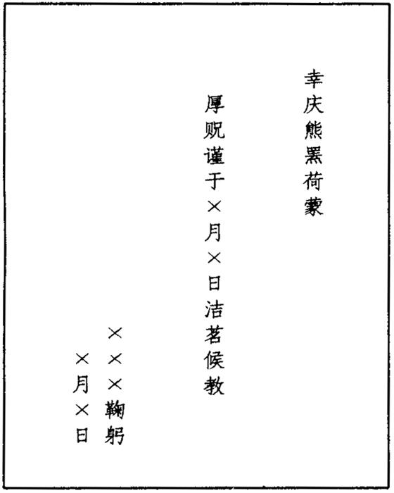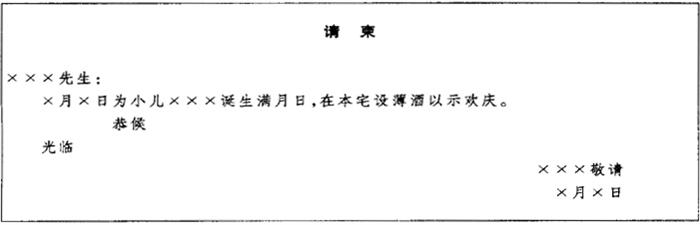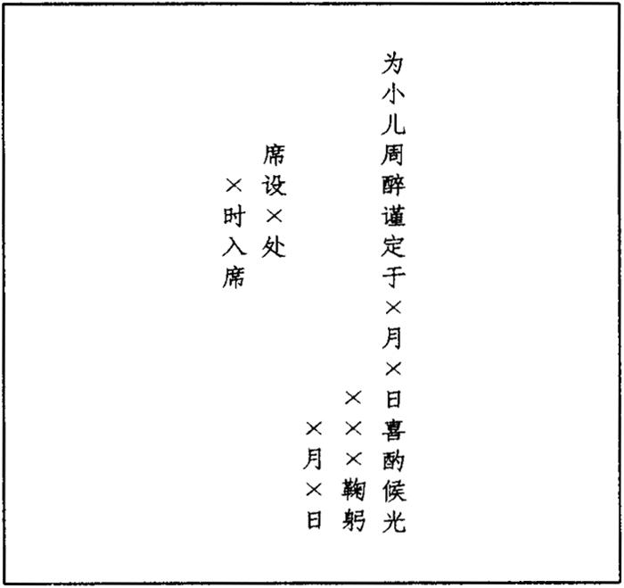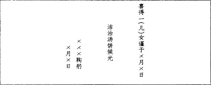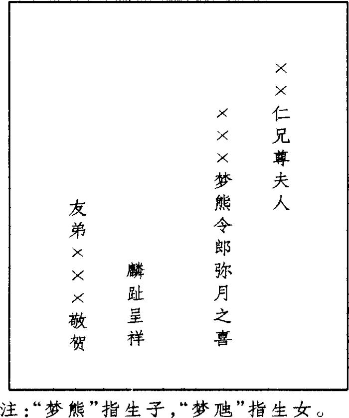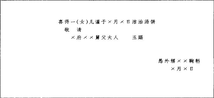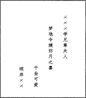 释义 | 贺生育 【简介】: 生育宴请一般是在出生、满月、周岁等时节举行。其庆贺文书通常包含两个方面的内容,一是祝友人喜添后嗣;二是祝小儿茁壮成长。用得较多的礼文是柬帖、贺信、贺电、贺诗、贺联和贺喜镜屏。 【范例】: 生子或生女请酒帖 生子满月请酒帖 注:“汤饼”是指自己置办酒钳的谦称。在比较古朴的帖文中,还有些固定用语,如用“熊罴”指男子,“弥月”即指满月,“周醉”指周岁。 请酒贴 贺生女信 ××仁兄: 一年未见,好生思念。昨获鹊报,知兄添了一位千金,真幸福极了。 记得你曾向我吐露过,希望妻子给你带来女儿,今天你可谓如愿以偿了。你们真有福气,爱情的结晶竟如此理想。她将来长大了,谅必是一颗亮晶晶的明珠。 我是一个粗夫,手头没有什么好做贺礼,只好送你一首贺诗,以表贺意了。 敬祝 俪安!并祝福母女俩平安健康! ×××谨启 ×月×日 贺生子信 ××兄: 昨接鹊报,欣悉你得一麟儿,可喜可贺!祝福母子俩平安健康! 小宝宝的降生会给你带来不少麻烦,但是有了他,整个家庭会更加愉快和欢乐。我想,当你为家务奔忙之余,看到小宝宝甜蜜的笑容时,你一定会感到非常幸福的。 我因远住效区,来往不便,一时无法亲往道贺,仅以此信表示由衷的祝贺。日后得空定携礼登府探望。专此奉贺 祝 俪安! 弟××敬贺 ×月×日 贺添孙信 ××亲家: 昨天亲家母带来大喜讯,××于×月×日生了个又白又胖的男孩,足有八斤半重,我们全家都很高兴,大家让我给你写这封信,表示祝贺。亲家母说,你们全家委托我给小外孙取个有意义的名字,我很乐意地接受了,我想了想,给他取名“××”,亲家看可好? 时下,亲家和亲家母工作都很忙,又添了小孙孙,要让你们受累了。××她娘在家呆不住,加上她也迫切想亲亲小外孙,她决定明天就动身去帮帮忙,同时也带去一点鸡蛋和小孩衣物,表示心意。过几天,我得空后,也想去看看。顺祝 平安 ××× ×年×月×日 贺生育电词语示例 △欣闻宝宝降生,遥祝母子(女)健康。 △欣闻喜获麟儿,特电祝贺。 △欣闻获得掌珠,特电示贺。 △欣闻有弄璋(瓦)之喜,电贺道安。 △恭贺添孙之喜,并祝合家欢乐。 △欣闻尊夫妇喜添千金,热忱致贺。 贺生育对联 生子联 雄声震屋 绿竹生嫩笋 佳气充闾 红梅发新枝 月窟培生丹桂子 英物啼声惊四座 云阶育出玉兰芽 德门喜气洽三多 春生子 风暖兰阶花吐秀 佳气充闾倍添春色 雷惊竹院笋抽芽 英声载路喜得宁馨 夏生子 瓜瓞远绵征夏日 子种莲房池有新茁 芝兰新茁似春初 梦延瓜瓞日见长绵 秋生子 川媚山辉蓝玉朗 月朗天高桂宫结子 天高月满蚌珠肥 地灵人杰崧岳生甲 冬生子 石麟果是真麟趾 瑞雪盈庭石麟降世 雏凤清于老凤声 祥云护舍玉燕投怀 双胞胎 花萼相辉开并蒂 两美同生祥开达适 埙篪齐奏叶双声 一孪竞秀誉迈效郊 生孙联 瓜瓞欣看绵世泽 美济凤毛兰荪茁秀 梧桐喜报长孙枝 谋贻燕翼瓜瓞绵长 生曾孙 喜见梧桐开四叶 天赐石麟祥开四叶 福陈箕范祝三多 庭投玉燕瑞霭一堂 生女联 喜结心中伴 双喜临福地 欣生掌上珠 千金耀华门 喜见绿竹抱新笋 彩笼高悬添喜气 福来红楼藏玉珍 桃盘新设识芳姿 珍珠入掌门楣喜 绕庭争看临风玉 兰惠吐芳庭院新 照室更喜入掌珠 贺生育镜屏 贺生子 贺生女 贺添孙 贺友人小儿满月 贺生育匾(幛)词语 贺生子 秀茁兰枝 兰阶添喜 庆衍弄璋 未来希望 喜听英声 雏凤清声 优生优育 革命后代 贺生女 弄瓦徵祥 明珠入握 设帨凝辉 未来女英 巾帼继人 时代新葩 弄瓦志喜 庆衍龙女 欢心得宝 祖国花蕾 贺添孙 堂开四世 庆衍龙孙 饴座增欢 兰芽茁秀 贺生育封包 民间习俗,遇有亲友喜事或丧事时,可用红纸或白纸,包上钱作为礼物送去,以表心意。一般在封包纸面上要写上几个字,表示风雅和庄重。封包词语要根据送礼目的而定,较为简单的是在封包纸正面中央写上:“×仪”和下封。如 一般请人代笔用“笔仪”,婚庆大事用“喜仪”、“贺仪”,祝寿用“寿仪”,贺迁居用“燕仪”,贺升学用“芹仪”、“花仪”,其中菲仪、薄仪、微仪较为通用。 但更多的是,人们除了在封包面上写上自己的姓名外,同时还须写上一个表明贺什么喜或吊什么丧的贴切的词语。下面即列举几种贺生育封包词语: 小儿三朝 三洗之喜 汤饼之会 汤饼流香 生子满月 弄璋之喜 梦熊之喜 熊罴之喜 天降麟儿 玉燕投怀 麟趾呈祥 日出之光 悬弧之庆 生女满月 弄瓦之喜 月出之光 梦虺之喜 设帨之喜 握珠之喜 男孙满月 兰芳之敬 庆衍龙孙 女孙满月 兰芳之敬 庆衍孙娇 曾孙满月 芝瑞之敬 满月通用 弥月之喜 小儿周岁 试周之喜 |