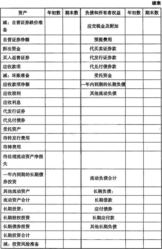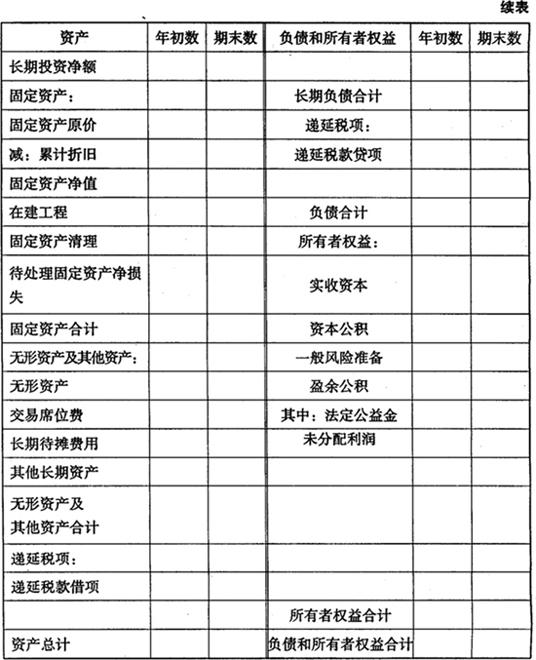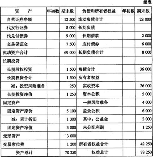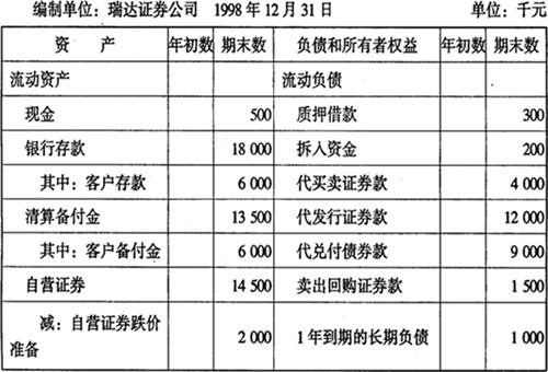 释义 | 资产负债表的编制 (一)资产负债表的格式 资产负债表的格式一般为账户式,即资产负债表分为左方和右方,左方列示资产各项目,右方列示负债和所有者权益各项目,左方合计数等于右方合计数。通过账户式资产负债表可以反映资产、负债和所有者权益之间的内在关系,使资产与负债和所有者权益之间的恒等关系一目了然。证券分司资产负债表的一般格式如表3-4-13所示。 表3-4-13 资产负债表 补充资料:代保管证券(面值)__元 (二)资产负债表的编制方法 资产负债表由表头、表身、附注三部分构成。表头部分应列明报表名称(资产负债表)、编表单位名称、编制日期和金额计量单位;表身部分反映资产、负债和所有者权益的内容,是资产负债表的主体和核心;附注部分为补充说明。 1.资产负债表项目的排列 (1)资产负债表左方各项目的排列。 资产负债表的左方一般分为流动资产和长期资产两类。流动资产是指在1年以内或一个营业周期以内将会变现或者耗用的资产,包括现金、银行存款、清算备付金、应收股利、应收利息、应收款项、自营证券、代发行证券、代兑付债券、买入返售证券、拆出资金、受托资产、待摊费用、交易保证金等。长期资产是指在1年以上或超过1年的一个营业周期以上才会变现或耗用的资产,包括长期投资、固定资产、无形资产、交易席位费、长期待摊费用等。 上述项目按照资产的流动性进行排列。流动性强的资产,如现金、银行存款、清算备付金、自营证券等流动资产排在前面,长期投资、固定资产、无形资产、交易席位费等长期资产不容易变现,排在后面。 (2)资产负债表右方项目的排列。 资产负债表右方用以登记负债和所有者权益。负债分为流动负债和长期负债两类。流动负债是指在1年以内或超过1年的一个营业周期以内需要偿还的债务,包括质押借款、拆入资金、应付款项、应付工资、应付福利费、应交税金及附加、代买卖证券款、代发行证券款、代兑付债券款、卖出回购证券款、受托资金等。长期负债是指偿还期限在1年以上或一个营业周期以上的债务,包括长期借款、应付债款、长期应付款等。 所有者权益是指公司投资人对公司净资产的要求权,包括实收资本(或股本)、资本公积、一般风险准备、盈余公积、未分配利润等。 上述项目是按照需要偿还的先后顺序进行排列的。质押借款、拆入资金、应付款项、代买卖证券款、代发行证券款、代兑付债券款、卖出回购证券款、受托资金等流动负债排在前面,长期借款、应付债券等长期负债排在中间,在公司清算之前不需要偿还的所有者权益排在最后。 2.资产负债表数据的主要来源 会计报表的编制,主要是通过对日常会计记录的数据加以归集、整理,使之成为有用的财务信息。我国资产负债表各项数据的来源,主要有以下几种方式: (1)根据总账科目余额直接填列。 资产负债表各项目的数据来源,主要根据总账科目期末余额直接填列,例如“现金”项目,主要根据“现金”总账科目的期末余额直接填列。 (2)根据明细科目余额计算填列。 资产负债表的某些项目不能根据总账期末余额,而应根据有关明细科目的期末余额计算填列,如“待摊费用”项目根据“预提费用”、“待摊费用”科目的所属相关明细科目的借方计算填列;“预提费用”项目,根据“待摊费用”、“预提费用”科目所属的明细科目的期末贷方余额计算填列。 (3)根据总账科目和明细科目余额分析计算填列。 资产负债表上某些项目需要根据总账科目和明细科目余额分析计算填列,如“长期借款”、“应付债券”、“长期应付款”、“长期债券投资”等项目,应根据相应科目的总账余额扣除其所属的明细科目中反映的将于1年内到期的部分,分析计算填列。 (4)根据报表各项目数字抵消计算填列,以反映其净额。 如“长期投资”减去“长期投资减值准备”后得到“长期投资净值”,“固定资产”减去“累计折旧”后得到“固定资产净值”,“自营证券”项目减去“自营证券跌价准备”后得到“自营证券净额”等。 (三)资产负债表编制举例 下面通过一个简例说明资产负债表的编制。 瑞达证券公司1998年末的科目余额表如表3-4-14: 表3-4-14 瑞达证券公司1998年末科目余额表 单位:千元 注:清算备付金中客户的清算备付金有6000000元。应付债券中有1000000 元在1年以内到期。盈余公积中包含公益金2000000元。 根据上述科目余额表和资料编制如下资产负债表(表3-4-15): 表3-4-15 资产负债表 |