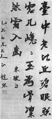 【简介】: 近代·赵熙书。纸本。行书。诗四句。凡四行,共三十二字。刊于《民国时期书法》(下)。 【赏析】: 这件行书轴是赵熙晚年所作,写得遒厚雅逸,朴华练达。他的用笔能兼具沉劲与飒爽;结字出于六朝,而又随机变化,敛纵对比,神情警策稳健而姿致潇洒,能兼具雄强与雅秀。这些特点,都出自于赵熙碑帖兼收而相济的书艺观及其创作实践。他说:“凡天姿頴者喜南书,挟胜气者喜北书。南多工而北多拙,拙近古而工近今。各有长短,相济而不相非,斯杰士矣。”正因爲此,他从帖到碑,从颜眞卿、赵孟頫到汉魏,“豪杰挺然风气外”,锤炼成了自己的风格,其影响尤盛于巴蜀,而延续至今。