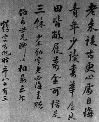 【简介】: 近代·方旭书。纸本。行书。七言诗一首。凡六行,共五十二字。刊于《民国时期书法》(上)。 【赏析】: 方旭书法从唐入,上追二王,得帖学旨要,尤其于颜平原、柳诚悬、董香光处最有心得。其书作以行、楷爲佳。此行书稿法度谨严,面貌俊朗苍朴,意态温润平和,遒劲沉著;结体舒展,庄整秀逸;用笔凝练老到而颇有韵致,使转劲健;行章列布,行距空阔,字距淸疏;水墨相适,情韵并生,血肉附骨,横平竪直,点画鈎连不失矩度;势正气蕴,毫不浮躁。但书家的主体精神和个性不太鲜明。尽管这样,耄耋之年的书家,笔端尙能如此劲健,眞是难能可贵。