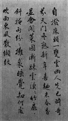 【简介】: 现代·马衡书。纸本。行书。凡十二行。刊于《民国时期书法》(中)。 【赏析】: 马衡的行书横披抄录了自作的两首诗。我书写我诗,情至笔发,走笔自如。这件行书可以溯源至王羲之的《兰亭序》及《圣敎序》,与近人沈尹默的行书有相似之处。作品最突出的特点就是柔和妍美。作者用笔提多于顿,行笔轻巧敏捷。外形丰容委婉,如春风融融水波相拂,阳春三月般的明媚。作者于线条的驾驭分外纯熟,没有一笔犹豫或过失,而结体精美、阔绰。这样的作品风韵在智永、赵孟頫、董其昌、王文治等人笔下都展示过,他们都是用妍美形式给人们以美的享受的。张怀瓘曾认爲:“风神骨气者居上,妍美功用者居下”,有些评论者也常把风骨与妍美当作对立的两面。褒扬风骨铮铮、气字轩昂,有著挟风般磅礴气势的作品,而把妍美认爲是人工斧凿的产物,赵、董曾无数地充当这类的典型。实际上,妍丽不能只与软弱爲伴,与矫饰爲伍。马衡的行书在妍美之中不乏筋骨,妍而不甜,妍而不俗,但他不著意于气势,而以小品般的温馨扣击人们的心扉,它不激起欣赏者不尽的联想和澎湃的思緖,却如酽茶一杯,细细品后,方能感到有味,而且持久。