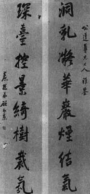 【简介】: 近代·顾印愚书。纸本。行书。自撰八言联一副。上、下联正文十六字,款十四字,共三十字。刊于《民国时期书法》(下)。 【赏析】: 顾印愚的行书典雅俊逸,韵致淡远,书卷气息浓郁。此联的特点在于:笔韵淸丽自然,力量极含蓄;结字巧中有拙,不堪经意,字势似洒落而实遒密,姿致之硕美与米芾颇有相似处。他的书法,虽质朴胜于米,但秀逸有余,没有米芾那样纵横不羁的豪宕之气;笔力之精劲,笔势之奇诡多变,气机之流蕩也远不逮米。这种差别,确也不是靠功夫所能消除的,不能不受到作者自身的气质、才情、襟度的制约。