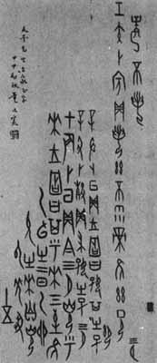 【简介】: 现代·董作宾书于一九四四年。纸本。篆书。凡十一行,共九十三字。刊于《民国时期书法》(下)。 【赏析】: 罗振玉是最早书写甲骨文的人,他以金文之笔入卜文,板滞有余,韵致不足。董作宾所书甲骨文,笔致圆润秀丽,端庄静雅,由于他本人对甲骨学涉猎与研究较广深,故能得其甲骨之神韵、趣味,这件作品中所书甲骨文轴,是摹写卜辞原文,章法根据甲骨而布置,有高低疏密,字略有参差错落,行气贯通,相映成趣。结体一般都偏长一点,用笔仿契刻之意,多起落笔都是尖的,中段略粗,故其字体婉曲舒徐,顾盼自若,有一种挺劲端凝秀雅之气溢于纸上。(刘江) 董作宾的这幅甲骨文书法作品字形取法武丁时期甲骨文书体。由于甲骨文是用尖利的工具契刻在龟甲或兽骨上的文字,若以柔软的毛笔来表现锋利坚劲的契刻效果,是很不容易的。这幅书作向观者展示出作者深沉的笔下功夫和对形式美的追求。他并不硬摹契刻刀迹的细瘦尖硬,而是发挥笔墨的自然效能,写得淸润朗健,骨肉停匀,神完气足。字的结构整肃峻峭,形态变化自然。最有特点的是作品的章法,首先,前两行的疏朗独立与后八行的茂密成阵相映成趣。其次利用行字的多少变化,在通篇布局上表现出作者明显的构图意识—前两行以第二行爲主形成顶天立地的长条形,再以后八行构成梯形,佔据中下及左下角部分。最后,以两行行书款字布于左上角,与正文部分相呼应,并破中上及左侧的空白,右下侧的条形空白,则以右下角白文印章破之。整幅作品虚实对比十分强烈,但感觉平衡统一,有肃穆之美。