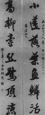 释义 | 赠品三仁兄七言联 【简介】: 淸·胡 【赏析】: 此幅行书作品从笔法与气韵来看,颇得宋代米芾书法的韵味。作品最大的成功之处是气韵生动,尤其重视整体的气韵,而不拘守一点一画之得失,如上联中的“莲”字、“鱼”字,下联中的“高”字、“鹭”字等,某些点画已经合併或省减,甚至看不出具体的每一点画的起止和运动,也就是说,从这些局部来看,似乎并不完美和生动。但是,如果把它们放到整个作品中来考察的话,显示出书写重点的不断变化,在不断运动中显示出相当稳定的效果。 此幅作品气韵生动的另一个重要因素是,就一个字来说,笔势连贯,得气得势,如下联中的“牵”字,变化了笔顺,使一个本来写起来很难连贯的字,显得非常得气得势而生动活泼。又如“丝”字,变下部的点爲一长横,而且与上部连接十分紧密,使整个字显得旣稳定,又非常连贯。不仅是一个字的内部点画连接贯气,更重要的是字与字之间又以笔势相连。乍看起来,字与字之间是断开的,没有萦带或牵丝,但实际上形断而意未断,形不连而势连。使欣者仿彿看见了在字与字之间的笔意连绵的牵丝,这就是整幅作品的行气连贯,气势的连贯和跳跃,是整幅作品气韵生动的另一个重要原因。 |