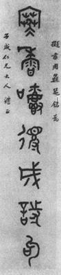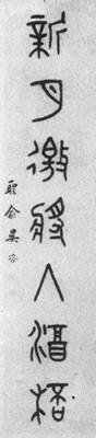 释义 | 赠子成仁兄七言联 【简介】: 淸·吴咨书。纸本。篆书。七言联一则。凡上下联正文十四字,款十九字。刊于日本《明淸书道图说》。 【赏析】: 由于吴咨精通六书,又擅篆体,故临写金文维妙维肖,很是得体。此联虽爲吴氏纵笔随意而书,但行笔超逸沉著,苍古自然,浑朴挺劲,疏密停匀,气势贯通,柔中寓刚,有著较高的艺术价値。整幅字形相当匀称,给人以一种疏朗洁凈的感觉。字形结构方圆兼备。用笔中锋,笔势流畅,横竪转折运笔自如。墨的枯湿控制极好,笔道瘦硬凝练,笔划粗细均匀,首尾如一。字形大体呈长方形,但某些偏旁转折的地方却用圆笔,局部与整体在艺术效果上形成辩证的统一,全篇看来很是协调,表现出端庄而不呆板,活泼而不流媚的艺术风格。 |
