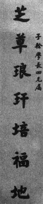 【赏析】: 黄钺此楷书七言对联,字法端劲,布置停匀,雍容閑雅。其用笔之精,结字之妙,尽备唐楷法则。细析其底蕴,似近颜、柳。一般人常常会见到有些师颜的楷书,或厚成臃肿,或字拙入笨,或挑勾失度,或横平竪直,显得呆板无生气。可是此幅楷书作品,深得颜体雄浑,开阔之精髓,写得端庄雄强,古雅纯和,气足神閑。用笔方圆相兼,显得圆聚有力。同时,点的姿态繁多,或俯或仰,或向或背,左顾右盼,随字异形,生动而稳重,给人们以用笔灵活,沉著稳妥的感觉。横画一般都重起重收,中间稍细、向上微凸,如“云”、“宝”、“培”等。倘若一个字中出现多笔横画时,笔笔不同,错落有致,如“培”、“玕”、“琅”等字。倘细析其用笔,还可发现提按不露猛烈之影,虽中和而不弱,静美而不滞,积雄健爲内势,化刚柔爲一味,构成一幅完美的佳作。 |