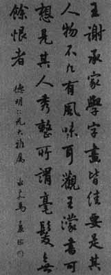 【简介】: 现代·马公愚书。纸本。行书。凡四行,共五十字。刊于《民国时期书法》(中)。 【赏析】: 马公愚幼承家学,于诗、文、书、画方面打下坚实的基础,书法自秦汉碑刻和锺王,下至明淸近代,无不心领神会。马公愚于书法四体俱佳,尤精于行书。他的行书稳实峻厚,淸爽舒长,风神疏朗大有唐风气象。章法上行距气宽,字距留白,字字淸朗,圆润有劲,丝毫不觉有算子之恶。平整之中有精神,血肉齐备;滋润之中藏透纸的劲力。从这幅墨迹中可见他笔墨纯熟,传统功底深厚。追晋人、法唐人和吸取宋明淸等前辈书法艺术的营养,更于董香光处出精神。出于“感慧徇知”而赠人翰墨,抑制著主体情緖的大波大澜,“志气平和”,稳稳实实从头至终,胜券在手,成竹于胸,笔到意到,点画淸楚,交待明白,违而不犯,和而不同。全章笼罩在和谐的氛围之中,体现出一种传统的文人情趣,给人舒心畅快之感。