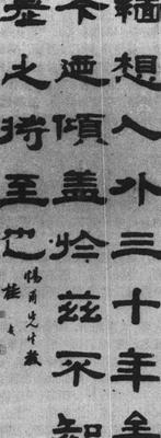 【简介】: 淸·桂馥书于乾隆六十年(1795)。纸本。隷书。凡三行,每行八字,共二十八字。124.2×45.8cm。故宫博物院藏。刊于日本《中国书道全集》(八)。