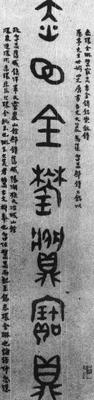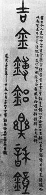 【赏析】: 此篆书接近西周金文较爲成熟时期的风格。特点是,线条遒劲稳健,结构匀称凖确,布局妥帖,在转折的方圆处理和字形的结构安排上,又富有变化,尤其是笔画的两端尖锐劲利,不落呆板,具有浓厚的装饰意味。细加审观,此作品中线条方圆转折淸晰可见,带有强烈的笔势,其中颇见匠心的是“琳”字的“王”旁,让其沉在结构底部,使此字结体左下角和右上角,互相呼应。章法上,上下两联拼合在一起,行列有序,整肃无犯,恰好与其结体各臻其妙。通观此联,端庄沉凝,雄浑高古,使人有“如飮醇醪,不觉自醉”之感。 |