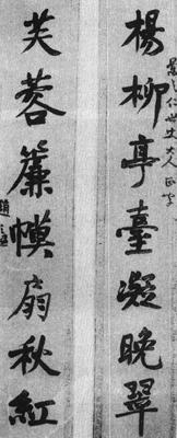 【简介】: 淸·赵之谦书。纸本。行书。七言联一则。凡上下联正文十四字,款十二字。刊于日本《明淸书道图说》。 【赏析】: 对于赵之谦的书法,后人最常见到的是其后期那种个性强烈风格成熟、妍美圆融、沉著劲健的北碑书体(楷书、行书),像本品这类明显带有颜(眞卿)书笔意的早期书作,却很少见到。 靑年时期的赵之谦与何绍基一样,都以颜书笔法写行书,但何是直接宗法颜的行书,书法属颜行与北碑的结合体;而赵是从颜的楷书获得啓发,因此,与何行书的流畅相比,赵的此帧对联更多地含有“生”与“拙”的意味。  如果再与作者后期北碑书体相比较,本联的用笔特点是“圆”和“虚”。“圆”是指起收笔的圆势和用笔的肥厚,这也是颜书的最大特色;“虚”主要是指竪、撇、捺等出锋线条的末端墨色的枯竭,这是赵书不同于颜书的地方。 上述两点旣是赵之谦靑年时代书风的个性,又是一个潜在的危险。因爲颜眞卿式的圆笔在当时社会极爲流行,它极容易落入俗套;而虚笔则会导致作品的力量感不足。也许正是这个原因,赵后期摒弃了此种风格,而转向用笔“侧”和“实”的碑派书风。 赵之谦毕竟是一代书法大家,此作虽不像其后期作品那样老练,但我们从它爽利、潇洒的笔调中仍可窥见作者那种充满创造力的艺术灵性。 有必要谈一下本联的落款。上下款共十二字,不仅与正文配合得相当协调,而且其老辣痛快的侧锋笔势已完全达成了作者后期行草的成就。据此,我们说它比正文书法的艺术性更高。 |