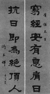 释义 | 赠有恒先生联 【简介】: 近代·冯玉祥书于一九四二年。纸本。隷书。七言联一则。凡上下联正文十四字,款十二字。刊于《民国时期书法》(中)。 【赏析】: 冯玉祥的隷书联,笔简意朴,有汉人风範。旣不鼓努爲力,也不柔媚取人,只是正正派派地写他抗日的信念,神定意足。落款的行书,方中寓图,厚重古朴,与联文很是和谐。 |