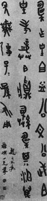 【简介】: 淸·赵之琛书。纸本。篆书。凡三行,共三十七字。刊于日本《明淸书道图说》。 【赏析】: 此条幅是晚淸书家赵之琛,以周代钟鼎彝器文字爲蓝本,爲友人摹写之作。通篇布局考究,文字大小起伏变化,错落有致。从“益公文公武”几字放弃直线排列常规,形成裏外参差落笔。“彊”字左右结构分野突出,“永”字的倾斜,“用”字上收下放等变化都表现出作者力图以跳跃、变化去打破布局中的呆板、沉寂,刻意追求大与小、静与动、严谨与活泼的和谐统一。 当时人们的目光还集中于小篆、隷书、楷书、行草上,此幅金文当是赵氏的尝试之作。赵氏书法素以工篆隷、长行草著称。他在用笔上中锋、侧锋交替出现,挥洒自如,下笔如利刀入木,收笔如断层、悬崖,突然、艰涩,似甲骨、类漆书。如“文”、“公”、“孙”等字十分明显。形成了变化淸新但不离古法,古朴而不失雅秀的独特风姿。   通篇行笔简洁明快,摆脱了金文的铸造痕迹,虽然他所处的时代还不曾见到甲骨文字,但这幅作品的笔意中已蕴含著甲骨的韵味。 |