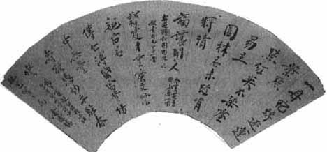 【简介】: 现代·曹靖陶书。纸本。行书。刊于《民国时期书法》(中)。 【赏析】: 此作以硬笔狼毫书就。运笔提按顿挫动势较大,转折分明,锋芒铦锐。横画起笔和收笔很重,而中截细而轻微,时有笔断意连之趣。竪鈎沉重而轻灵。一画之间,或一字之内,以笔画粗细轻重的对比组合,使字态活泼充满生气。点画间笔势相连,使楷书基体带有浓重的行书意味。结构上呈内紧外松,可见书家追取的是颜、柳等唐楷大家的风神气度。两首七绝诗,还要缀上详细的题款,这在一个小小的扇面上是颇难安排的。书家是擅写扇面的高手,他以“六—二”和“六—三”的格式题写诗句,章法上已经有错落感,加上每首诗末又书以小字短跋,形成疏阔处可以走马,密集处不能透风,大小交错杂而不乱的效果。前后两首诗旣自成篇章,又浑然一体,使读者抑扬顿挫有节奏地诵读扇面上的诗句的同时,又获得了这错落而又归于均衡的书法空间美感。