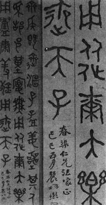 【简介】: 淸·曾熙书。纸本。大篆。凡三行,共四十五字。刊于《当代名人书林》。 【赏析】: 金文的最佳形态,莫过于笔划起止显露锋芒而不轻浮,点画丰腴却不失之笔势雄健。曾熙在此幅作品中正是把握住这一至难处。字与字之间气脉贯通、刚柔兼备,尙能窥其胸有成竹,心气融合,缓而慢的运笔走向。曾熙仰慕锺、王笔法并得力于华山、夏承二碑,尽皆兼收并蓄于金文之中。其非凡的胆识,过人的才气,趋使作品能入古而出新。故善于破平正,字迹疏放,结体稍长,章法大小错落,阴阳向背逈异,富于参差变化。在变化中蕴蓄著浓厚的金石气息。藏锋逆笔,中锋贯穿始终。笔力含蓄于波折扭曲的点画裏,意取浓烈的铜铸立体感。深得屋漏痕之妙。  淸沈曾植有云:“俊园于书沟南北融合方圆,皆能冥悟其所以分合之故,如乾嘉诸经师之说‘经’本自艰苦中来,而左右逢源,绝不见援据贯穿之迹,故能自称一家。”君不闻体峻者见气骨,体逸者见性情,态婉者得湖海之韵,态淸者得冰霜之神,曾熙此幅作品则兼而有之。 |