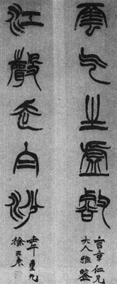 【赏析】: 徐三庚的此篆书五言对联,奇古生动,朴茂雄逸,笔画圆转流畅,字体丰腴凝重,变化自然,有著龙腾凤翥之势。其行笔淸健挺朗,宛转流畅。线条粗细参差,粗不臃肿,细不纤弱,无一点雕琢之习气。笔笔锋利逼人,平中求险,险中求平,神完气足。从此作品来看,书者挥洒时,追求乾湿浓淡并兼的墨韵,讲究布白的整体章法,做到意在笔先。用笔上,虽仍沿袭秦汉以来篆书用圆笔的规律,可是收笔处拖长,如“沙”、“壑”、“气”、“声,,等字,使笔画呈首粗尾细。再从结体来看,方中有圆,方圆结合,显得工整匀称。此联篆书配以隷书的落款,笔酣墨活,如玉珠联璧,相映成趣,构成完整的艺术境界。 |