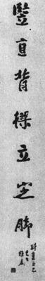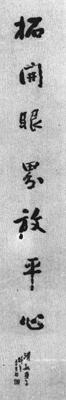 【简介】: 淸·钱慧安书。纸本。行书。七言联一则。凡上下联十四字,款十八字,共三十二字。刊于日本《明淸书道画说》。 【赏析】: 吉生所书七言对联“竪直背樑立定脚,拓开眼界放平心”,似乎是讲书法创作的经验,从中可以看出先生严谨的治学态度和对书法艺术的追求。 吉生的行书对联,平正、自然、静藏、逸趣,动有姿态。平正,是书法静止美的根本,“竪直背樑”跟脚稳健。在平稳的基础上,又力求自然。所谓自然,即无雕凿装饰之迹,朴实无华,此行书字与字的接笔处若断若连,运笔强健秀拔,而又流畅淸疏,有坚韧如屈铁之感。并且在平稳自然的基础上,又力求动态。如上联“定”“脚”下联“放”“心”等字,姿态生动,神采动人。   吉生行书,静中有动,势均凝聚,调和统一,显示出作者在创作中注入的感情倾向。“开拓眼界”是作者主张博学创新的见证,由于这种思想的指导,所以他的书法高古文雅、脱俗骇世。 |
