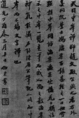 淸·吴荣光书。纸本。行书。题跋一则。凡七行,共九十九字。刊于日本《书道全集》(二十四)。