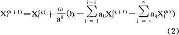 给定线性代数方程组  若aii≠0(i=1,2,…n),则解方程组(1)的超松弛选代程序为:  i=1,2,…n,k=0,1,… 其中 为任意初值。 将A分解为A=D-L-U,其中L,U分别为A的下、上三角部分(不包括对角元素),D为A的主对角元素所构成的对角矩阵,则(2)可写成下列形式: Xk+1=X(k)+ωD-1(b+LX(k+1)-DX(k)+UX(k), 或 X(k+1)=SωX(k)+fω, 其中Sω=(D-ωL)-1((1-ω)D+ωU) fω=ω(D-ωL)-1b 设Sω的特征值为λi(Sw),记 ,当A是实对称正定矩阵时,超松弛迭代程序总是收敛的指X(k)趋向于方程组的解X(*)。而对任意矩阵A,当且仅当ρ(Sw)<1时,迭代程序才是收敛的,且ρ(Sw)越小收敛的越快。因此ω的选取最好能使得ρ(Sω)取最小值,这个最小值所对应的ω称为最佳松弛因子,把它记为ωopt。 若A是对称正定矩阵且具有相容次序,则  |