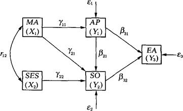 释义 | 路径分析 一译“因径分析”。 多元统计分析的一种。研究变量间的因果关系。回归分析方法在相关分析中的应用。1921年遗传学家S.赖特首先提出并用于生物学研究。 20世纪50年代以后引入社会科学的研究。基本步骤是先由研究者根据已有的知识和经验,提出一个表示变量间的因果关系的路径图,据此写出相应的数学模型;然后利用样本数据估计模型参数;并对参数作出统计检验,从而判断模型的合理与否;最后根据检验后的模型估计变量的效应大小。如五个教育变量:智力(MA)、社会经济状况(SES)、学术成就(AP)、重要的其他影响(SO)和教育抱负(EA)间的关系有如下的路径图。图中X1和X2的变异只受模型以外的变量的影响,称为外生变量。 Y1、Y2和Y3的变异主要受模型中的变量X1、X2或Y1、Y2的影响,称作内生变量。 内生变量也受模型以外的变量的影响,这些变量统称为误差项,分别记作ε1、ε2、ε3。 外生变量对内生变量的影响用单向箭头表示,起点表示原因变量,终点表示结果变量。外生变量间的相关用双向弯箭头表示,两者没有原因与结果之分。 模型假设各变量间的关系是线性的,各误差项互相独立。于是上述路径图就可表示成以下的线性回归模型:Y1=γ11X1+ε1,Y2=β21Y1+γ21X1+ γ22X2+ε2,Y3=β31Y1+β32Y2+ε3。 通常假设模型中的变量都是标准化变量(误差项除外),回归系数称为路径系数。不少文献将路径系数记为P,如PY1X1为由X1到Y1的路径系数。为与结构方程的记号一致,用γ表示由外生变量到内生变量的路径系数,用β表示由内生变量到内生变量的路径系数。路径系数的第一个下标表示结果变量代码,第二个下标表示原因变量代码。理论上路径系数可用回归分析方法求取。由于路径分析模型是特殊的结构方程模型(SEM),因此可用LISREL、AMOS或EQS等SEM软件进行分析。 |