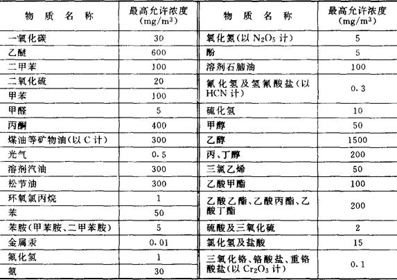 根据工业企业设计的卫生标准和国标建(GBJ)1-62规定,车间内有害气体、蒸气及粉尘最高含量的允许浓度如表6规定:
