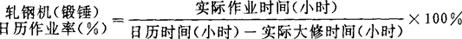 指轧钢机(锻锤)实际作业时间占日历时间的百分比。 它是反映轧(锻)钢设备在日历时间利用程度、操作技术水平、维修状况的技术经济指标。其计算公式为:  式中:日历时间是指报告期的时间,无论是否开三班,节假日是否开动,均按报告期日历天数乘以24小时计算;实际作业时间是指轧钢机(锻锤)实际生产运转时间,包括试小料和轧钢机(锻锤)在生产时的间隙、运转时间;实际大修时间是指大修理开始的实际停车时间至大修理完毕后开车正式试小料校验时为止的时间;大修是指设备恢复性的修理,即将设备全部拆卸,更换主要部件,并报上级批准以大修理基金费用支付的。 |