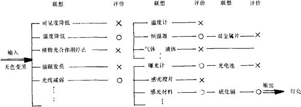 把创造对象的问题情境看作是一个具有输入-输出特性的“黑箱”,通过自由联想和评价逐步把“黑箱”转换成“白箱”,从而导致技术创造的一种方法。 最早由美国通用电气公司提出。运用这种方法,是把研究问题的初始状态即研究者所接受到的刺激看作输入,把技术创造对象的预定目标或功能看作输出,把实现目标或功能的要求看作是外部制约条件,以给定的输入为前提,通过一系列自由联想和评价,来寻找能实现输出并满足制约条件的技术途径和方法。以机器系统为例,运用输入-输出法要求说明3个方面的问题:(1)输入-进入的刺激;(2)输出-响应动作或反应;(3)规范-那些规定输入和输出及课题的其他方面的技术要求。例如,要设计一台清理旧砖的机器,可表述为:输入-用过的带有灰浆和涂料的砖块,砖块的尺寸大小不等;输出-使全部粘附砂浆的砖块只留下表层灰浆;规范-这种机器必须做到:每小时能清理500块砖;能清理各种尺寸的砖;不能损坏砖的表面,特别是砖角,制造费用不能超过3000美元。可以看出,研究者是架设在输入和输出间的桥梁,他只能在这两者之间的种种限制条件下进行自由联想和选择。运用输入-输出法的工作程序是:(1)定义对象的输入、输出性质、确定对象的“黑箱”特征;(2)如果对象是“黑箱”,输入和输出看不出有什么直接联系,就应该通过自由联想,考虑输入能与什么事物发生联系、输入会引起什么样的结果,等等;(3)根据输出和制约条件的要求,对联想的结果进行评价,排除不合适的设想;(4)将保留下来的设想作为新的出发点,继续进行联想,然后再进行评价,使认识逐步逼进所要求的输出。 如此循环往复直至找出把输入和输出联系起来的技术方案。以研制一种路灯自动开关装置为例,其输入是“天色变黑”,输出是“灯亮”,整个思维流程如上图所示。