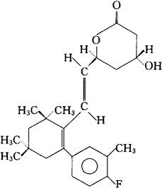 C24H31FO3=386.51 CAS-132100-55-1 [4α,6β(E)]-(±)-6-[2-(4-氟-3-甲苯基)-4,4,6,6-四甲基-1-环己烯-1-基]乙烯基]四氢-4-羟-2H-吡喃-2-酮。 (±)-6-[2-(4-Fluoro-3-methylphenyl)-4,4,6,6-tetramethyl-1-cyclohexen-1-yl]ethenyl]tetrahydro-4-hydroxy-2H-pyran-2-one,[4α,6β(E)]. (±)-(4R*,6S*)-6-[(E)]-2-[2-(4-氟-间-甲苯基)-4,4,6,6-四甲基-1-环己烯-1-基]烯乙基]四氢-4-羟-2H-吡喃-2-酮。 (±)-(4R*,6S*)-6-[(E)]-2-[2-(4-Fluofo-m-tolyl)-4,4,6,6-tetramethyl-1-cyclohexen-1-yl]vinyl]tetrahydro-4-hydroxy-2H-pyran-2-one. 降血脂药。 Dalvastatin,RG 12561. INN,USAN.  |