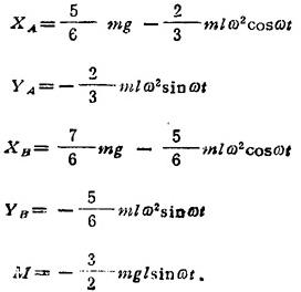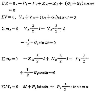 3.4.1 惯性力和惯性力系的简化 质点在惯性空间以加速度a运动,则定义质点的惯性力为 (其中m为质点的质量) (1.2-48) 质点系中各质点的惯性力所组成的惯性力系可以向任一简化中心简化,得到一个等效的惯性力和惯性力偶。该惯性力的矢量 等于原惯性力系的主矢,且可写为  式中 M为质点系的总质量; 为质点系的质心加速度。该惯性力的大小和方向与简化中心无关。简化得到的惯性力偶,其矩等于原惯性力系对简化中心的主矩,该惯性力偶矩的大小和方向随简化中心选取的变化而将发生改变。 刚体作平动、定轴转动和平面运动时,其上各点惯性力系简化结果见表1.2-23。 表1.2-23 刚体惯性力系的简化结果 解:1.以曲杆和转轴为研究对象;2。对象所受已知力有转动力偶矩M、CD、DE的重力P1=P2=mg;约束反力 、 、 、 ;3.CD的惯性力G1、DE的惯性力G2分别在它们的对称面内,且 ,G2=mlω2;4.建立图示坐标,有平衡方程:  解方程并代入G1、G2之值便可得  |