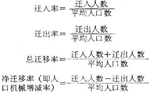指一国或地区迁出或迁入的人口数对平均人口数之比。 用千分数表示。迁出迁入所引起的人口增减变化,叫做人口机械变动。人口迁出迁入的数量同各地区的人口总数有密切关系。为了说明不同地区的人口迁移的规模和强度,不仅统计迁出迁入的绝对数,而且与该地区人口总数相比,计算迁移率。 根据所反映的内容不同,人口迁移率指标有四种:  上述四个公式的相互关系是: 总迁移率=迁入率+迁出率 净迁移率=迁入率-迁出率 在计算人口迁移变动的指标时,不仅要回答一个时期里迁入迁出各有多少,什么原因引起迁移,以便摸清人口的流动规律,同时,还要计算人口迁移的去向和从哪里迁来,移民计划的执行情况,以及分析造成人口流向和流量的各种因素。 |