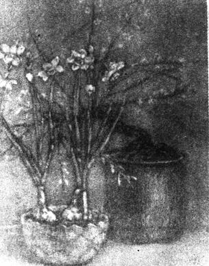 【作品赏析】: 色粉笔画,是西方传入的一种绘画体裁,其色彩、画法近似于油画、水粉。 但因是粉笔,都干画,层次不能多。近代西方,印象主义画家德加以色粉笔画舞女著名于世。我国近现代一些画家兼作色粉笔风景与静物、李超士即其一。 此画作于1962年春节,画一盆水仙、一盆迎春。 水仙的绿叶白花与迎春的嫩黄色,都淡雅、清幽,清寒中又透出一点欲暖的气息。水仙直立,迎春横互;水仙盆低,迎春盆高,错落有致。 两盆花嵌在空气浮动的暗色环境里,呈现一种离灿烂于宁静、平和的意境。李超士晚年作粉笔静物较多,其风格情调大都质重、浓艳、静远,流露著画家恬淡的心情,以及他对生命、生活的热爱。。 【作者介绍】: 李超士(1894-1971),名骧。 浙江杭州人。1911年留学法国,毕业于巴黎美术学院。 1919年回国,先后在上海美专、北平艺专和杭州艺专任教,解放后任山东美协主席,是我国著名的美术教育家和西画家。 。  现代 李超士 色粉笔画 作于1962年 |