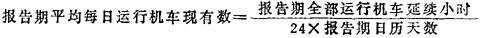 又称运用机车。指技术状态良好,正在参加各种工作的机车。它包括运行中、技术作业中、中间技术检查中和在机务段及折返段等候工作的机车。按其所担当的工作种别的不同,分为客运工作机车、货运工作机车、路用工作机车、补助工作机车、专用调车工作机车和其它工作机车。全国铁路、铁路局、铁路分局或机务段平均每日所拥有的运行机车台数是完成运输任务的重要条件。报告期运行机车现有数按报告期的每日平均数计算。计算公式为: