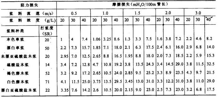 释义 | 近似计算法 [说明]由于纸浆的流动特性与水差别较大,因此,在计算浆管的阻力损失时,使用上述方法有较大的偏差,进而,可采用下面的近似计算法。 1.Z·J·MajcwSti计算法 [说明]此计算式仅适用于光滑的铜管或钢管,对铸铁管应乘以1.1,对塑料管应乘以0.8。 表2-5-15 浆料在铸铁管内的摩擦损失(u=1m/s时) |