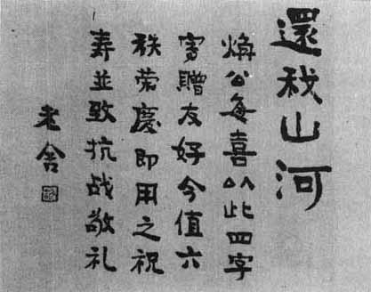 释义 | 还我山河寿词 【简介】: 现代·老舍书。纸本。行楷书。正文四字,款三十一字,共三十五字。刊于《民国时期书法》(上)。 【赏析】: 老舍以文名享誉艺林,而书名不著。从这件作品看,笔法简率,点画线条也趋同近似。但是,如果去其“皮相”,味其涵容,倒也浓郁芳馥,书意勃发。其字体势端正,加上厚重朴实的笔意,融篆、隷、楷、行于一炉,或方或圆,信手挥洒,字外书趣渐浓渐深,很有独到之处。 诗文有感而兴,书画缘情以作。老舍此作通篇充盈著深沉、自信和奋发的精神,不失爲书法艺术的佳品。 |