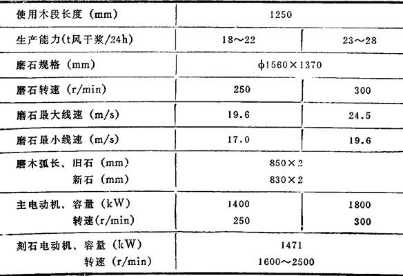 连续袋式磨木机在1923年由Kamyr公司生产,是一种可以连续磨木的水力操纵双活塞双袋式磨木机。 图7-2-13为卡米尔磨木机,两袋与水平面成35°角安装在机架两侧。磨木水压缸内径700mm,内有喂料水压缸,在磨木时喂料水压缸起著活塞作用,喂料水压缸内径400~450mm,内有喂料活塞。袋分上下两部分:下部分为梯形木库,靠上下斜面A和两侧各2个压钩将木段压向磨石,上部分为长方形料库,供装料的木段备用。当梯形木库下行磨木到终点即将开始后退时,喂料活塞及其压板B推动新木段向前,使磨木得以继续。当喂料压板将新木段推入梯形木库超过压钩位置时,压钩又压到新的木段上,梯形木库和压钩又开始新的磨木周期。 磨木机出浆侧机架上装有半圆形突出块,与基础板上半圆形洞相配合,可以此为中心,在更换磨石时,将磨木机的出浆口一侧倾向地面而使另一侧提高,留出足够空间便于磨石进出。 每袋磨石前装有一喷水管以清洗石面。这种磨木机没有推广到北美使用。 表7-2-5为卡米尔磨木机设备特征。 表7-2-5 卡米尔磨木机设备特征  |