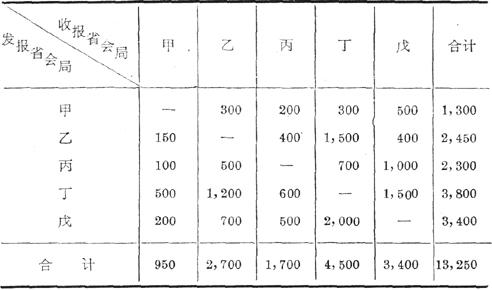亦称“业务流量”。 指邮电局、所之间有一定方向的,即从一地到另一地的通信数量。通信流量按各种业务进行统计。根据流量的性质,它又可分为:(1)干线流量,即首都、各省会、直辖市、自治区首府和一些指定的城市之间的流量;(2)省内流量,指省会与省内各市、县相互之间的流量;(3)县内流量,即县邮电局与县内各邮电分支机构之间的流量;(4)市内流量,即市局与市内各邮电分支机构之间的流量。 通信流量用一个以地区分组为中心的棋盘式平衡表表示。 为了消除某些偶然性因素的影响,表内各地之间的日流量应取不少于三天的资料的平均数。 下面是假设的某大区五省省会间某月三天电报平均日流量的平衡表: (单位:份)  表中左边是五个发报省会局,上边是五个同样的收报省会局。 这就便于了解区内各省会间电报的流向和流量。为了说明两地之间日平均总流量,可将本端至他端的主流量与他端至本端的进流量相加。 如表中甲乙两个省会局间的总流量等于甲至乙的300份加乙至甲的150份,共450份。利用这一资料就可直接了解区内任何两个省会之间电报总流量,观察现有电路是否满足需要或有无利用不充分等情况。 |
