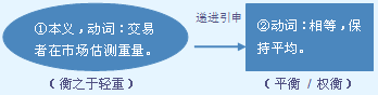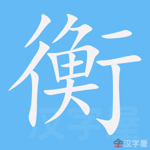 字源解说 衡,金文 = (行,商行、市场)+ (西,装货物的包囊)+ (大,人),表示将东西带到集市。造字本义:交易者在市场估测重量。籀文 省去“行” , = (西)+ (大)。篆文 承续金文字形。隶书 误将篆文的“西” 写成“鱼” 。 附 文言版《説文解字》:衡,牛觸,橫大木其角。从角从大,行聲。《詩》曰:“設其楅衡。” ,古文衡如此。 附 白话版《说文解字》:衡,是牛角上的横木,因为有些牛脾性暴倔,喜欢用尖角抵触人或物,造成损失,所以在牛角上绑上比两角更宽的横木,这样使牛角不能直接抵触到人或物。字形采用“角、大”作边旁,用“行”作声旁。《诗经》上有诗句唱道:“设计一款牛角上的横木。” ,古文的“衡”是这样写的。 引申线索