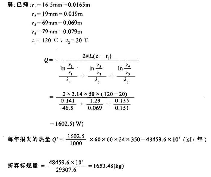 释义 | 通过圆筒壁的定态热传导速率计算 1.单层圆筒壁 式中 Q——传递热量(kJ) L——圆筒长度(m) r1、r2——内径及外径(m) t1、t2——内外表面温度(℃) 2.多层圆筒壁 式中符号含义及单位均同上 ]例]有一直径为Φ38×2.5mm的蒸汽管,共50m长,导热系数λ1=46.5W/(m·℃),为了减少热损失,在管外包上两层绝缘层,第一层是50mm厚的蛭石,导热系数λ2=0.0697W/(m·℃),第二层是10mm厚的石棉泥,λ3=0.51W/(m·℃),若管内壁温度为120℃,石棉泥外表温度为20℃,求该蒸汽管损失的热量?如果标煤的发热值为29307.6kJ/kg,求每年损失的热量折标煤多少吨? |
