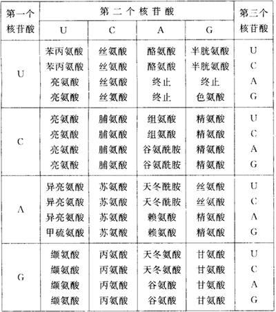 核酸链上核苷酸序列与多肽链上氨基酸序列相联系的讯号。 在蛋白质生物合成过程中,DNA分子中贮存的遗传信息先要抄写在mRNA上;mRNA则作为蛋白质合成的模板,其分子上以一定顺序相连的三个核苷酸为一个密码子,决定一种氨基酸(或指令蛋白质合成即翻译过程的起始与终止),同时其分子上特定的密码子顺序也决定相应氨基酸在多肽链上所占有的线性位置,即多肽链的氨基酸顺序。因此,蛋白质生物合成的遗传密码就是遗传信息通过mRNA指令多肽链以特定氨基酸顺序合成的单位,是指mRNA中的密码,全部密码子见下表。遗传密码的主要性质是:(1)三联体:每三个连续的核苷酸决定一种氨基酸;(2)无逗号:所有三联体密码子都是连续的,中间没有不作为密码子的核苷酸;(3)不重叠:按著一种读码方式,任何两个相邻的密码子没有共同的核苷酸;(4)兼并性:多数氨基酸可分别由几个密码子决定;(5)正确性:起始密码子AUG(在mRNA分子链内为甲硫氨酸编码)可保证正确地从一个mRNA分子的起点开始、依次读出密码子,终止密码子可避免读过头;(6)统一性:地球上现有生物的遗传密码都是基本相同的。 表3 遗传密码表