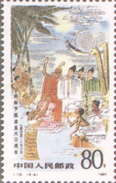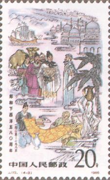 释义 | 郑和下西洋五八〇周年 发行日期:1985年7月11日 齿孔度数: 印刷版别:影写版 票幅:31×52 全张枚数:40(10×4) 设计者:李大玮 印刷:北京邮票厂 (1)8分 伟大的航海家郑和 1423.76万枚 (2)8分 和平的使者 1179.46万枚 (3)20分 贸易与文化交流 1033.76万枚 (4)80分 航海史上的壮举 1007.56万枚 (1)-(4) 4枚全 |