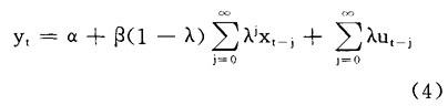 释义 | 部分调节 部分调节模型的基本形式描述了yt的最优水平 yt*=α+βXt (1) 例如,这可能描述了作为销售量x的函数的最优存货水平规则,实际水平的调整ytyt-1是本期合意(最优)水平#和上期实际水平yt-1之间差距的一个比例: yt-yt-1=(1-λ)(yt*-yt1)+ut (0≤λ≤1) 或 yt=(1-λ)yt*+λyt-1+ut (2) 当前实际水平是合意水平和上期实际水平的加权平均,调整参数λ反映了输入变量xt将结合到yt中的程度。将(1)代入(2),有: yt=α(1-λ)+λyt-1+β(1-λ)xt+ut (3) 对(3)进行反复迭代就产生了移动平均形式 其无限移动平均扰动可以写作εt,其中 εt=λεt-1+ut (5) 所以,部分调节的移动平均形式具有AR(1)扰动 |