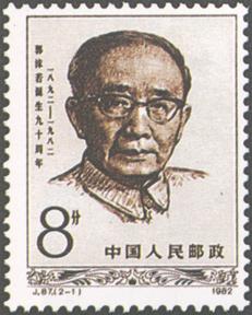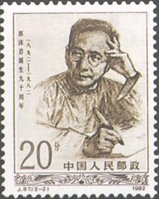 释义 | 郭沫若诞生九十周年 发行日期:1982年11月16日 齿孔度数: 印刷版别:影写版 票幅:30×40 全张枚数:50(10×5) 设计者:李印清印刷:北京邮票厂 (1)8分 郭沫若像 1000万枚 (2)20分 郭沫若在工作 600万枚 (1)-(2) 2枚全 |