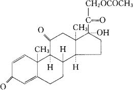 C23H28O6=400.47 CAS-53-03-2(prednisone) 17,21-二羟孕甾-1,4-二烯-3,11,20-三酮-21-醋酸酯。 17,21-Dihydroxypregna-1,4-diene-3,11,20-trione21-acetate. 肾上腺皮质激素类药。有影响糖代谢、抗炎、抗过敏、抗毒、抗恶性淋巴组织疾病等作用。用于肾上腺皮质功能减退症、结缔组织病、严重的支气管哮喘、皮炎等过敏性疾病、急性白血病、恶性淋巴瘤等。 醋酸强的松,去氢可的松醋酸酯,泼尼松醋酸酯,醋酸去氢可的松。 Prednisone Acetate,Delta-cortin,Delcortin. 醋酸泼尼松片,醋酸泼尼松眼膏(醋酸强的松眼膏)。 MI.