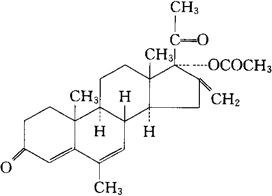 C25H32O4=396.53 CAS-2919-66-6 CAS-5633-18-1(melengestro1) 17-(乙酰氧)-6-甲基-16-亚甲基-孕甾-4,6-二烯-3,20-二酮。 17-(Acetyloxy)-6-methyl-16-methylene-pregna-4,6-diene-3,20-dione, 17-羟-6-甲基-16-亚甲基孕甾-4,6-二烯-3,20-二酮醋酸盐。 17-Hydroxy-6-methyl-16-methyleneprenga-4,6-diene3,2O-dione acetate. 孕激素类药,抗肿瘤药。 美仑孕酮醋酸盐。 Melengestrol Acetate,BDH 1921,MJ 5373,NSC70968,U 21240. INN,BAN(Melengestrol),USAN.  |