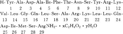 释义 | 醋酸舍莫瑞林 C149H246N44O42S·xC2H4O2·yH2O CAS-114466-38-5 CAS-86168-78-7(sermorelin) 29-L-精氨酰胺-30-去-L-谷氨酰胺-31-去-L-谷氨酰胺-32-去-L-甘氨酸-33-去-L-谷氨酸-34-去-丝氨酸-35-去-L-天冬酰胺-36-去-L-谷氨酰胺-37-去-L-谷氨酸-38-去-L-精氨酸-39-去甘氨酸-40-去-L-丙氨酸-41-去-L-精氨酸-42-去-L-丙氨酸-43-去-L-精氨酸-44-去-L-亮氨酰胺生长激素释放因子(人胰岛)醋酸盐水化合物。 29-L-Argininamide-30-de-L-glutamine-31-de-L-glutamine-32-de glycine-33-de-L-glutamic acid-34-de-Lserine-35-de-L-asparagine-36-de-L-glutamine-37-deL-glutamic-acid-38-de-L-arginine-39-de-glycine-40-de-L-alanine-41-de-L-arginine-42-de-L-alanine-43-deL-arginine-44-de-L-leucinamide-somatoliber-in(human pancreatic islet),acetate(salt),hydrate. 生长激素释放因子(人)-(1-29)-肽酰胺醋酸盐水合物。 Growth hormone-releasing factor(human)-(1-29)-peptide amide,acetate(salt),hydrate. 生长素释放药,诊断用药。 Sermorelin Acetate,Geref. INN & BAN(Sermorelin),USAN. |
