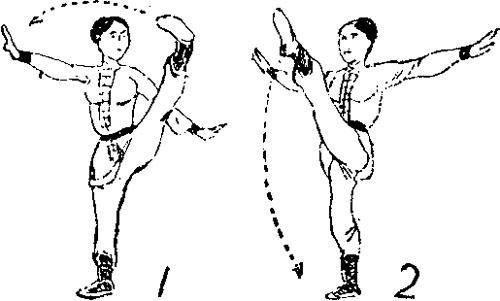 支撑腿自然伸直,全脚著地。另一腿从体侧踢起,经面前向里作扇面摆动落下,动作轻快有力,上身正直,用于防护对方攻击头面部,或我攻击对方头面部。