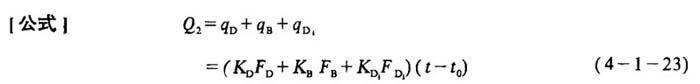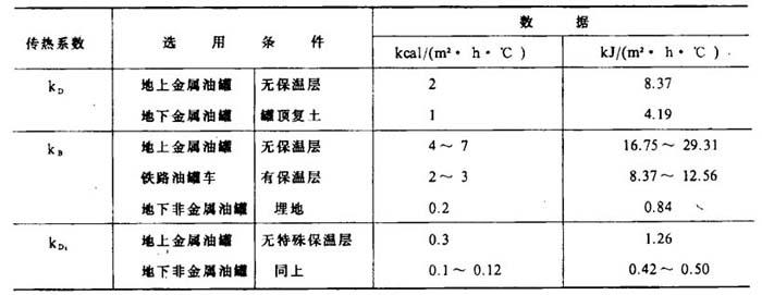 式中 Q2——热损失(kJ/h) qD——经罐顶散失的热量(kJ/h) qB——经罐壁散失的热量(kJ/h) qD——经罐底散失的热量(kJ/h) KD——传热系数[kJ/(m2·h·℃),见表4-1-4 FD——罐顶表面积(m2),对于铁路油罐车和卧式油罐车,取FD=0 KB——油品经罐壁向空气的传热系数[kJ/(m2·h·℃)],见表4-2-4 FD——罐壁表面积(m2) KD——油品经罐底向土壤的传热系数[kJ/(m2·h·℃)],见表4-1-4 FD——罐底面积(m2),对于铁路油罐车和卧式油罐,取FD=0 t——油品的平均温度(℃);在贮油罐中加热时取: 表4-1-4 重油加热传热系数   在铁路油罐车中加热时取:  t1——油品加热初温(℃) t2——油品加热终温(℃) tQ——周围介质温度(℃) 表4-2-4 日本不同浆种实际用水量(m3/t产品)  |