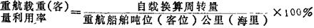释义 | 重航载重(客)量利用率 指船舶在重航里程中定额吨位(客位)的利用程度。它是反映运输船舶在重航中负载能力利用情况的指标。其计算公式为: 以100%与重航载重(客)量利用率相减,又可算出运输船舶吨位(客位)的亏载率,即: 亏载率=100%一重航载重(客)量利用率(%) |