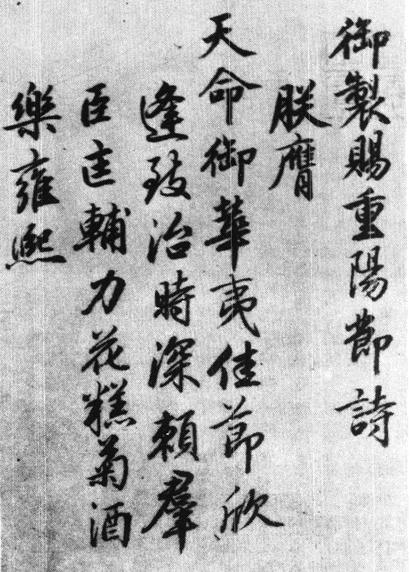 【简介】:  明·宣宗朱瞻基书。行书。纸本。凡六行,行二—八字不等,共三十五字。27.4×18.5cm。刊于日本《书道全集》(十七)。 【赏析】: 此明宣宗《重阳节诗》,笔画较粗。结体大多匀称优雅。也有部分字的结体具有平王转折变化。字多呈长方。结字中宫紧集,让笔画向四面展开。如“朕”、“天”、“命”、“欣”等字。笔划之间时有牵丝显露,如“深”、“花”、“雍”等字。又有的字中笔画肥瘦明显,使结构做到虚实得神。尽管宣宗受到沈度的影响较大,但却能另闢蹊径,可从此书中看出,在短短的六行字中,行楷相间,笔触富有内在联繫,行笔节奏富有变化,给人以爽朗劲健的感受。就宣宗此作品而言,其功力技巧可称爲明帝第一。正如明汪珂玉《珊瑚网》所说:“今复睹章皇帝朱瞻基御迹,足可压阁中帝王书也。”然论其艺术个性却显得不够鲜明。 |
